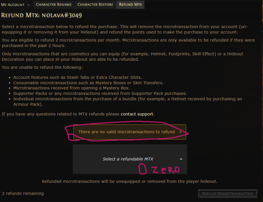I have spent a good share over the past months but made some purchases that I'd rather have refunded as I happen to not use them like gem effects for the gems I am no longer using, but the mtx refund system keeps on telling me that I do not have any refundable MTX on my account, which is absolutely not true. I have plenty that were not a part of any pack, bundle etc, plenty that were bought simply by buying coins and buying them in the store. So how do you actually get this thing to work? screenshot of what i see below: ![]() MinMax meister. Last bumped on Apr 9, 2026, 4:03:32 PM